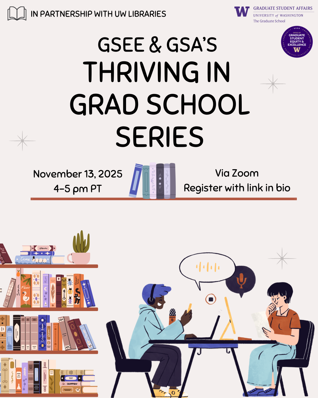 The Office of Graduate Student Equity & Excellence (GSEE) and Graduate Student Affairs (GSA) host events and programming designed to help all graduate students thrive while at the University of Washington and beyond. Our programming and events are open to all UW graduate students, faculty, and staff.