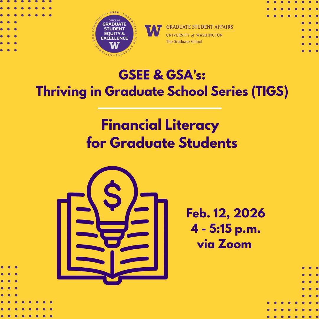 The Office of Graduate Student Equity & Excellence (GSEE) and Graduate Student Affairs (GSA) host events and programming designed to help all graduate students thrive while at the University of Washington and beyond. Our programming and events are open to all UW graduate students, faculty, and staff.